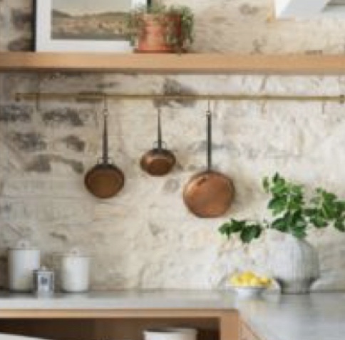 The kitchen is open and welcoming. There are custom European inspired cabinets and open shelving. Antique and wooden bowls that are used and loved. Hand crafted plates and platters.There is an antique brass rail with S hooks to hang pots and utensils. Hand made tile for the back splash. A turned leg island with a bottom shelf. Nothing is trending or trendy. It’s all old world, French inspired with clean lines