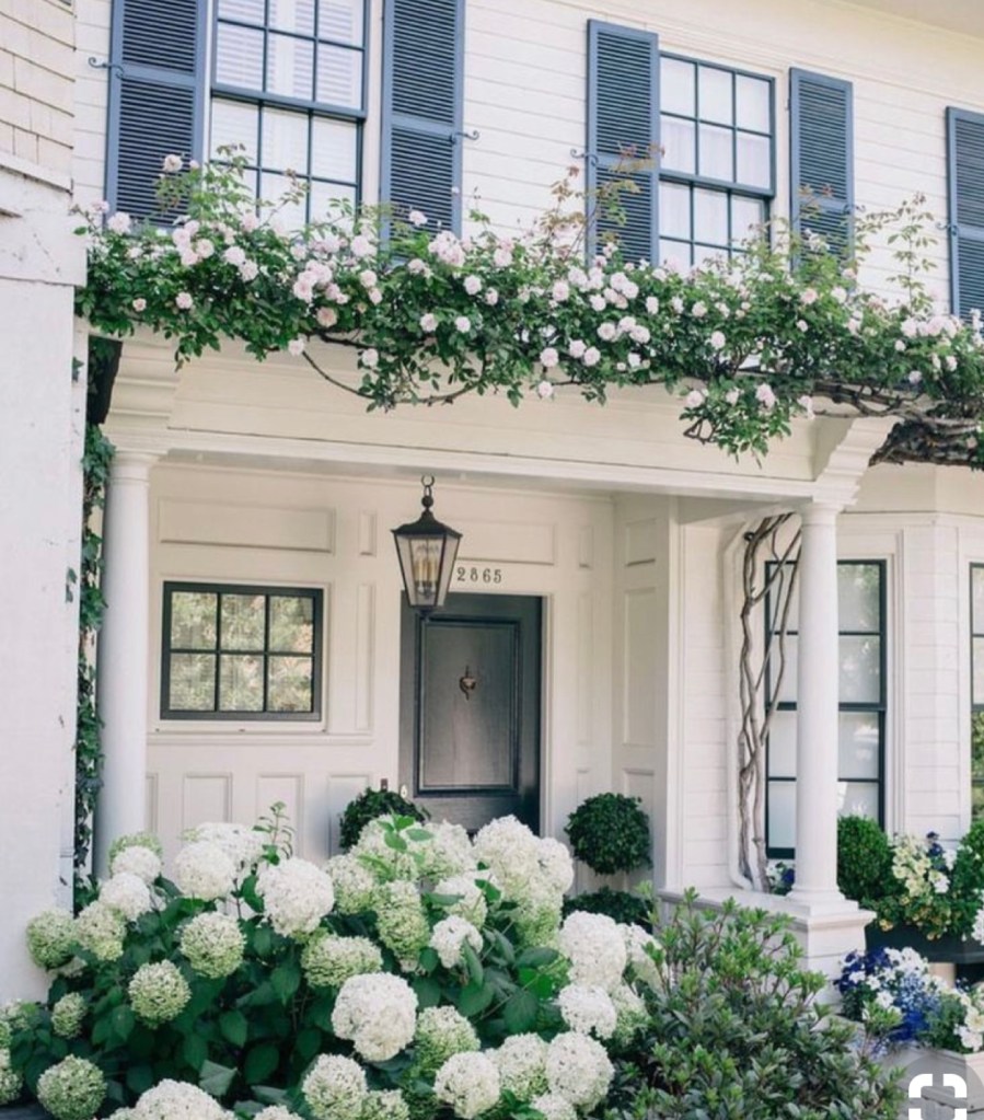 The exterior is welcoming and pleasing to my eye. The porch is inviting and lovely. Landscaping is simple, tidy but abundant with flowers and foliage.