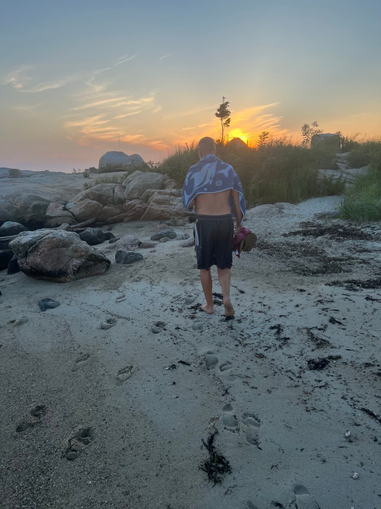 Morning and evening walks have been amazing. The weather is beautiful, the beaches are charming. Pink skies. Little breezes to cool off balmy nights.