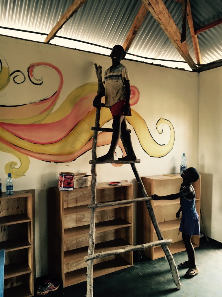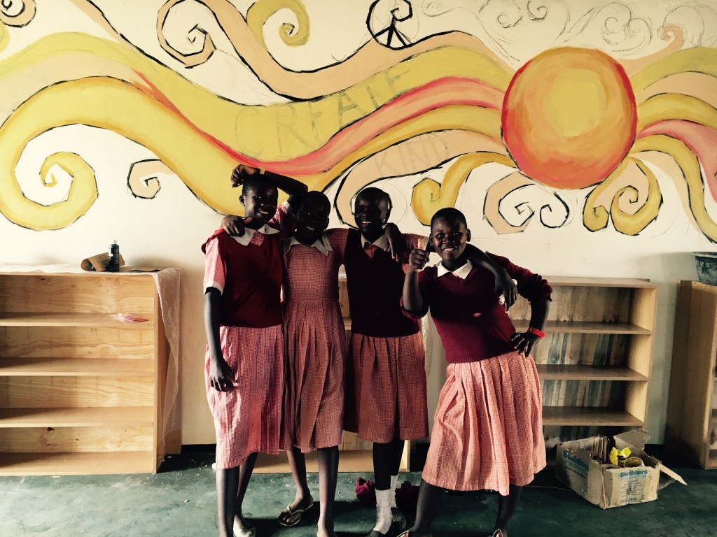 I loved all of it. The town where the school was being built was tiny. I think the whole town hung out with us while we were there, particularly the children. Even the teenagers. I think they loved the art part the most. Several sat around me drawing while I painted. When I needed a ladder, someone MADE me one and the kids showed me how easy it was to go up and down. I had less than a week to plan, find paint and complete the mural. We didn’t know the size before we arrived so I didn’t have as much time as I would have liked. We had brought art supplies for the school, but there was such little time to demonstrate how to use them. Scissors we’re included and some of us thought since they hadn’t ever seen scissors before they were not a good idea. I had taught little American kiddos who couldn’t use scissors before, so I was sure they would be fine but I had to prove it. I sat down with a handful of boys and showed them once. All of them respectfully took a turn and of course had no problem. The director and I joked later that these were kids who used machetes, our school scissors would be fine.