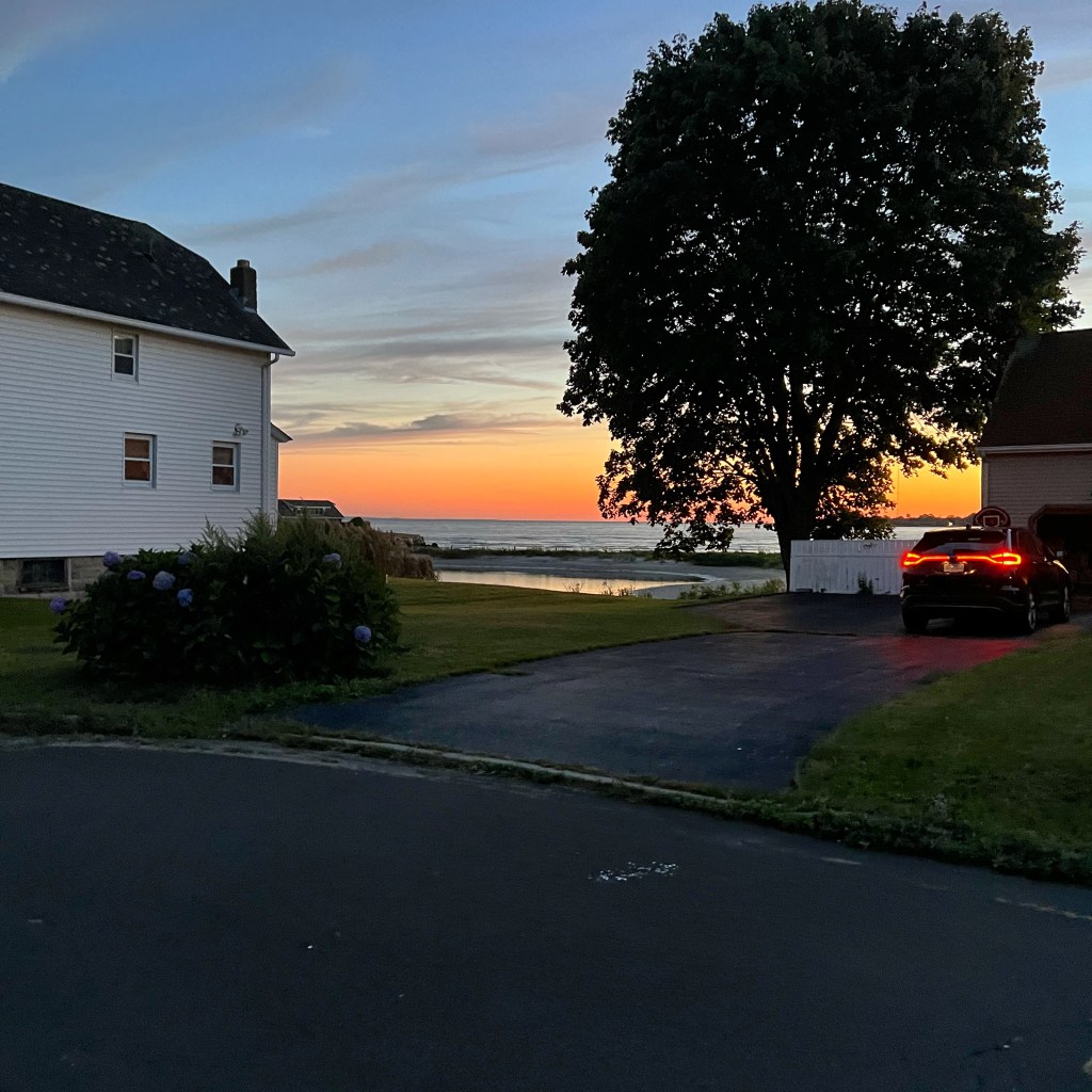 After dinner I’ve been walking with Gs mom. Sometimes the three of us go. It’s a nice stroll around the block past charming cottages jumbled together without fences. Sometimes we go as far as a pleasure beach. Neighbors are friendly, the sunset skies are beautiful, the evening air is refreshingly cool.