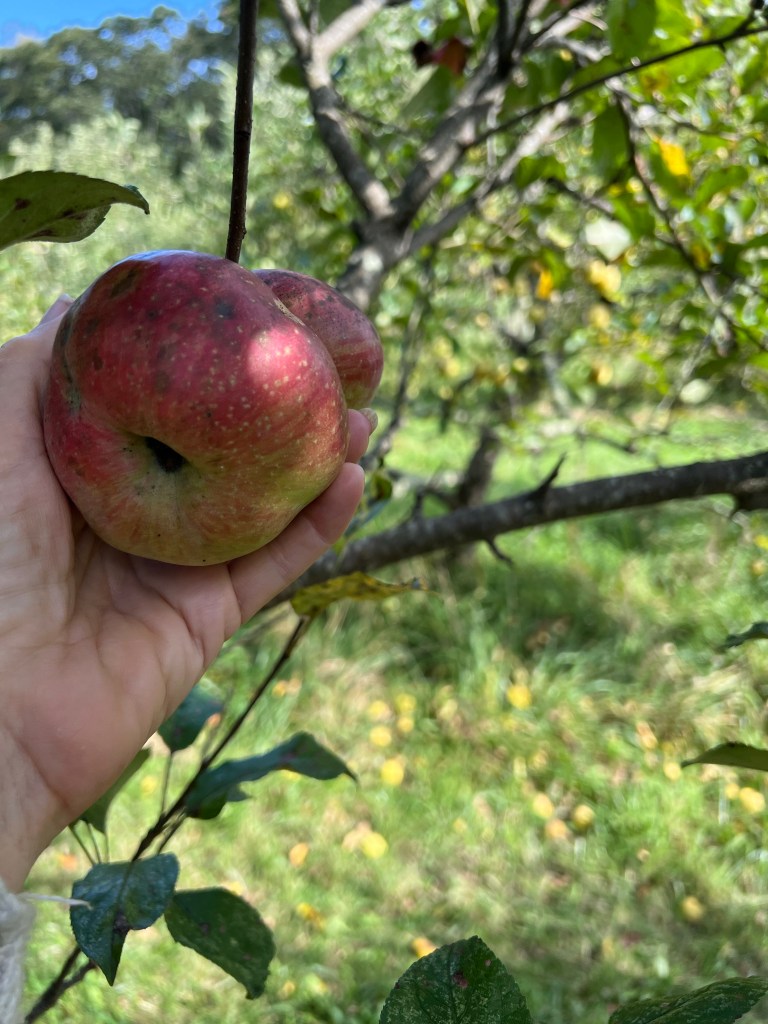 Third time was a charm. Fifteen minutes from the house we are staying at, down a long street that looked like someone’s driveway, tucked behind a couple of out of place looking houses, there was a beautiful property with a pond, a barn and apple trees. Beauty for as far as the eye could see. A band was even playing in the barn, they were good! We were offered apple crisp and cider by a welcoming owner.