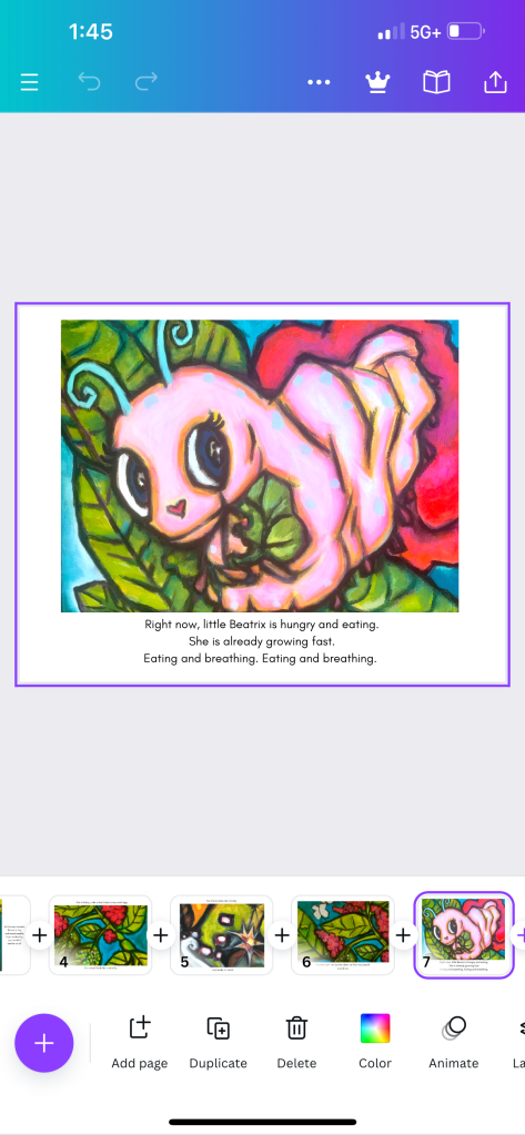 Her cycle of transformation from egg to caterpillar to butterfly is a true to life, scientific story that is also a metaphor for change. As we follow along, we are all encouraged to breathe with Beatrix as she patiently spends time in each phase.