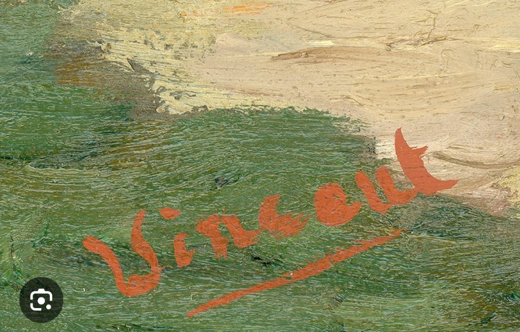 Yet here I am, pen in hand, stalling. Often I’ve had to go back to a collectors house and sign because I forgot or couldn’t decide where and then forgot. It’s a whole thing. I like the way that Van Gough signed his paintings. Big bold, sometimes in red, sometimes orange, Vincent, not Van Gogh, always with bravado. He didn’t care, it seemed, whether he would sell the painting or not when he signed. He just wrote confidently, underlined, as if he somehow knew that one day his signature would be worth something.
