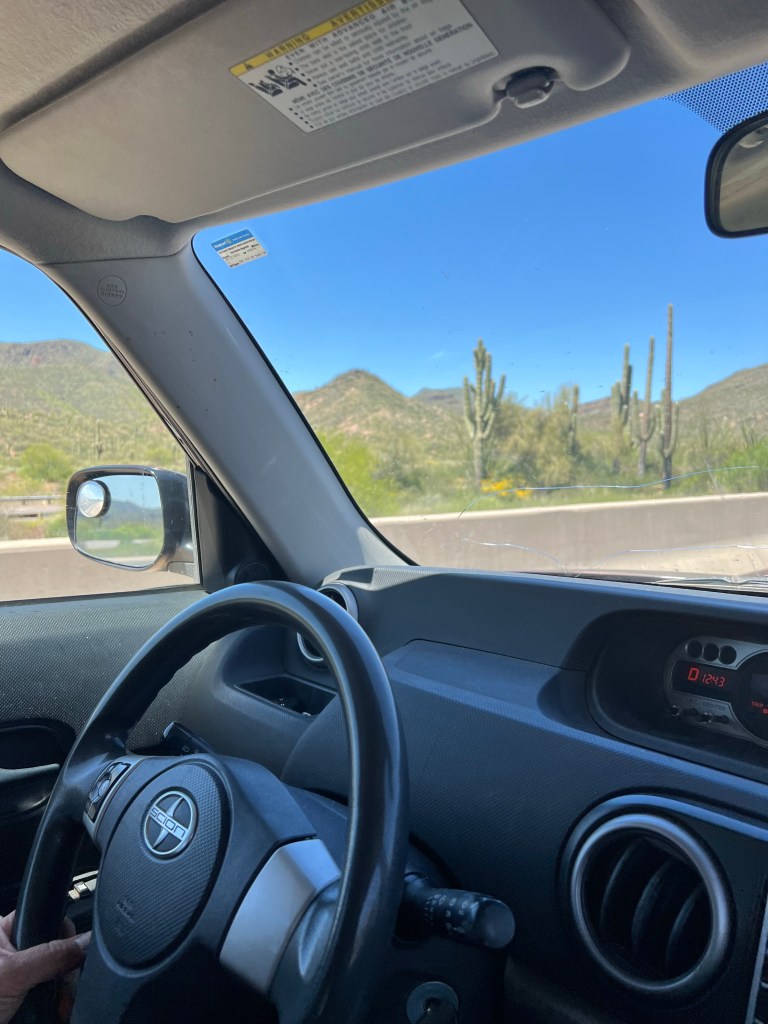We left this morning. The drive has been beautiful. I’ve never seen the desert so green. The saguaro cactus which were everywhere until they weren’t, looked especially healthy and hydrated. More flowers than I’ve ever seen along this highway. I kept trying to take pictures, but we were moving too fast. G said we would stop but there was never a place to.