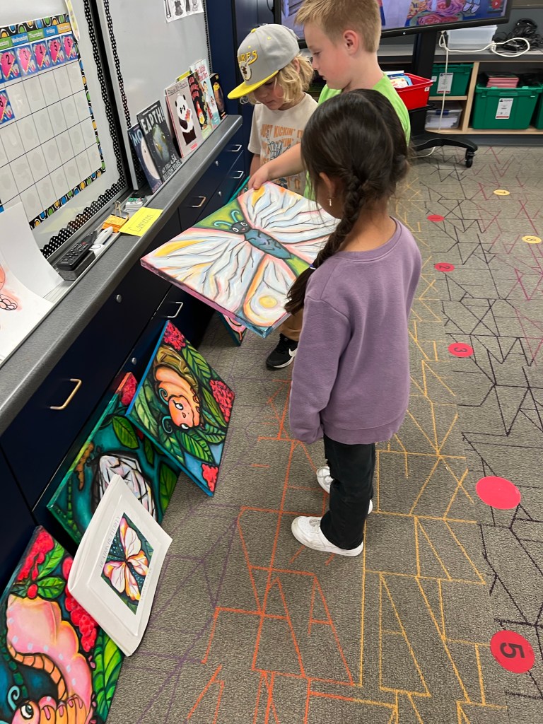 One of my favorite pictures is the one with the kids holding one of my paintings discussing the illustrations They remind me of mini art collectors.