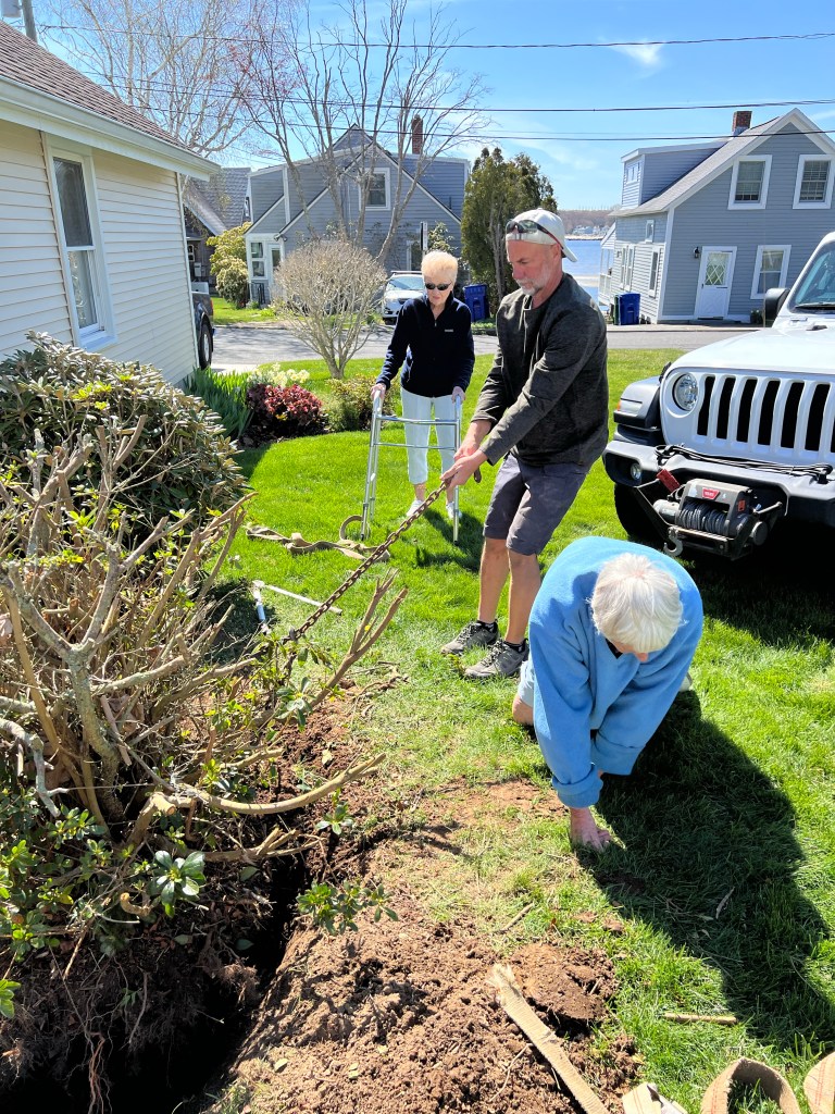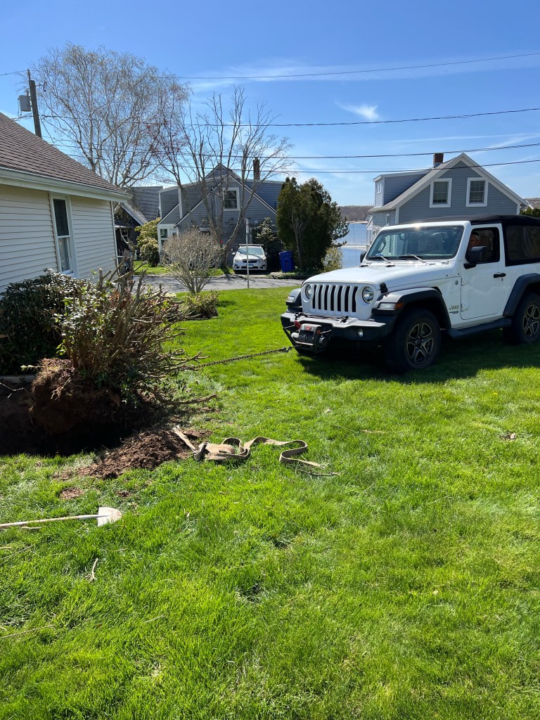 After hours of digging and prying (and jumping) and cutting through so many roots, we hooked a chain to the wench thing on the jeep and pulled the azalea out! Tomorrow we need to get out the chainsaw again!