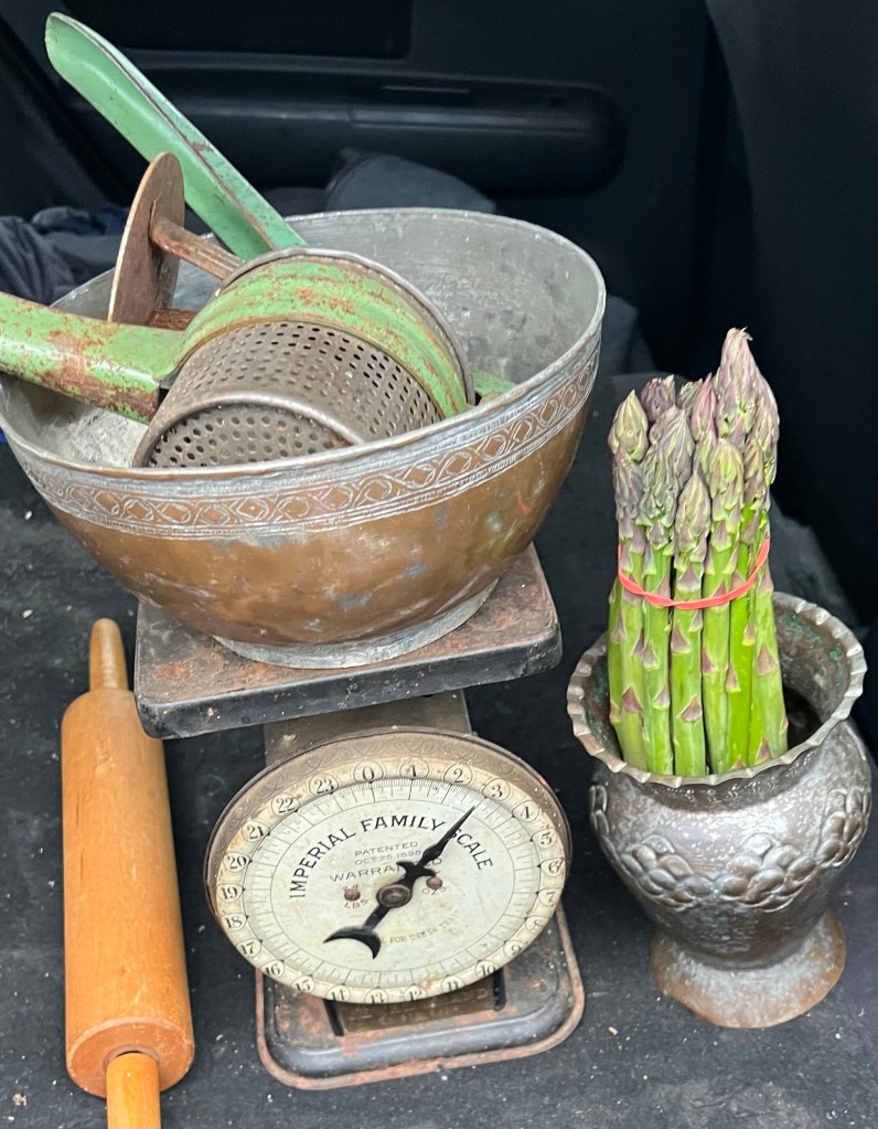 We left with a stash of frugal purchases that make me smile. One because they were well negotiated and two because they were all unexpected. A vintage rolling pin for a dollar? I love old rolling pins. (It was a little broken). A potato ricer, (I will be cleaning off the rust and absolutely using it), a baseball style tshirt that says BRIM on it (new). A bowl, a vase, two ball caps and a Stevie Nicks hat. Three hats for $10, G only found two he liked, so I got talked into the Stevie Nicks number. (all new) a vintage kitchen scale, 18 color pencils for 1$ and one bunch of asparagus.
