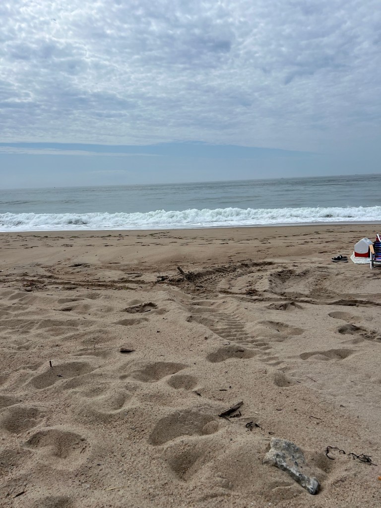 I brought a jacket and a sweat shirt which was a good idea (I’m learning), because it’s neither warm nor sunny, but the waves are surfable and the sand is warm. It’s lovely…