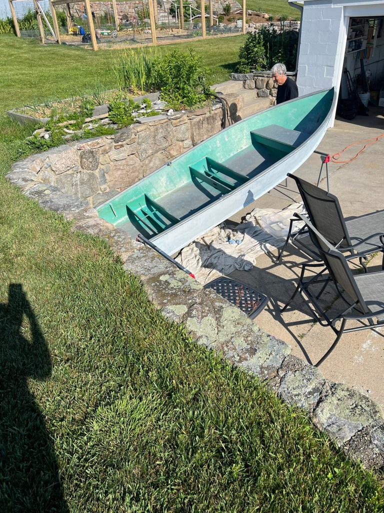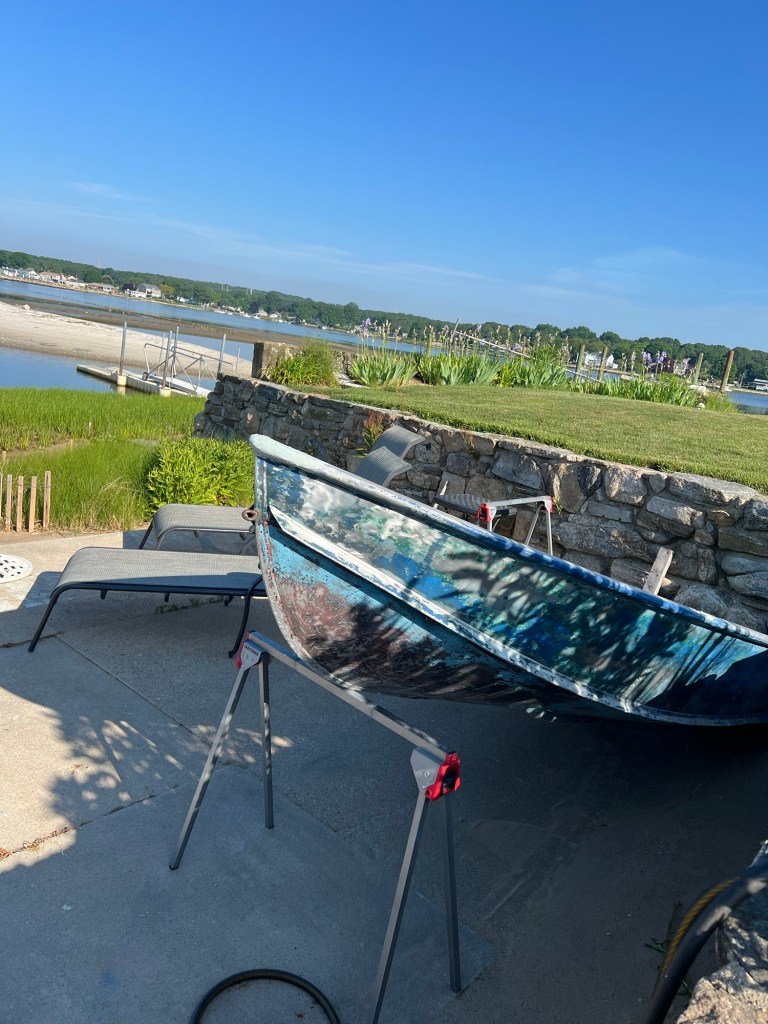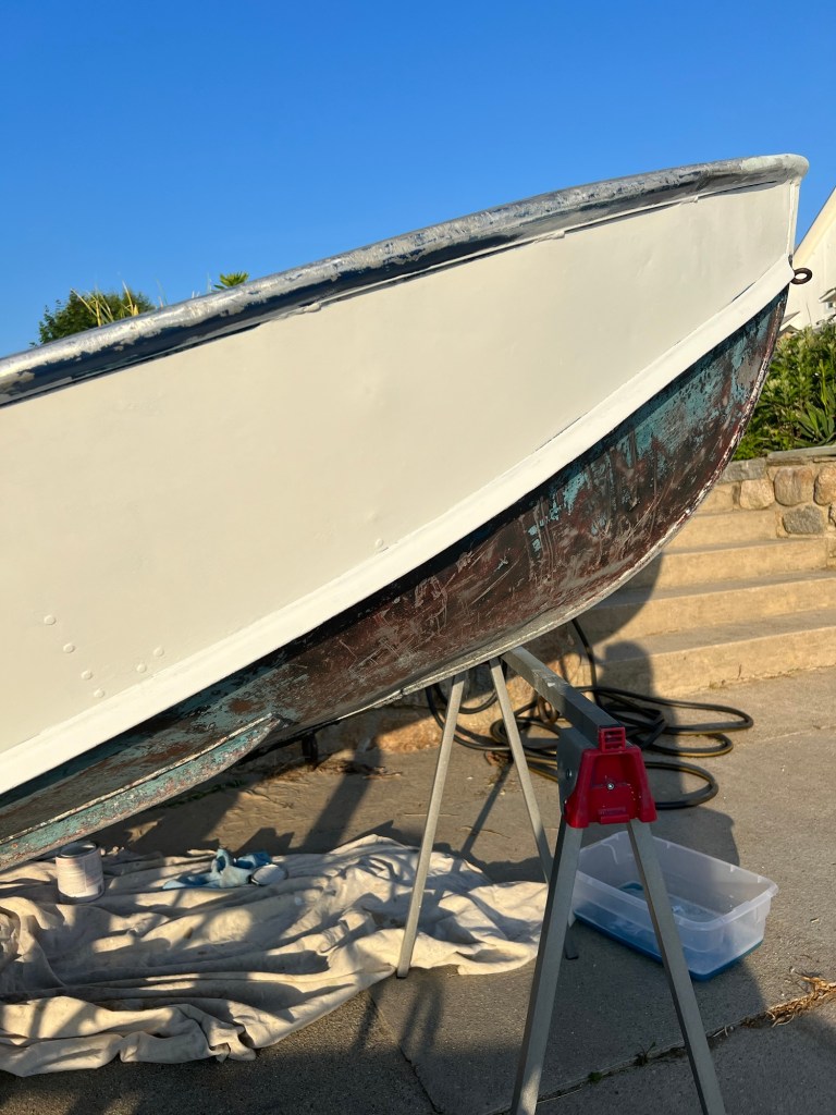 Now that I’ve completed the sanding and started priming, everyone is excited. We caught the attention of several neighbors earlier on, but now there’s a glimpse of where things are going. Soon there will be wooden board seats to replace the missing metal ones. There will be oars of course, there’s talk of motor…