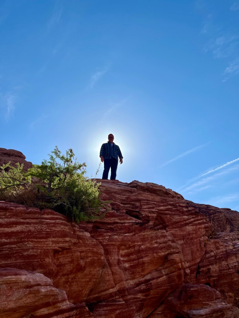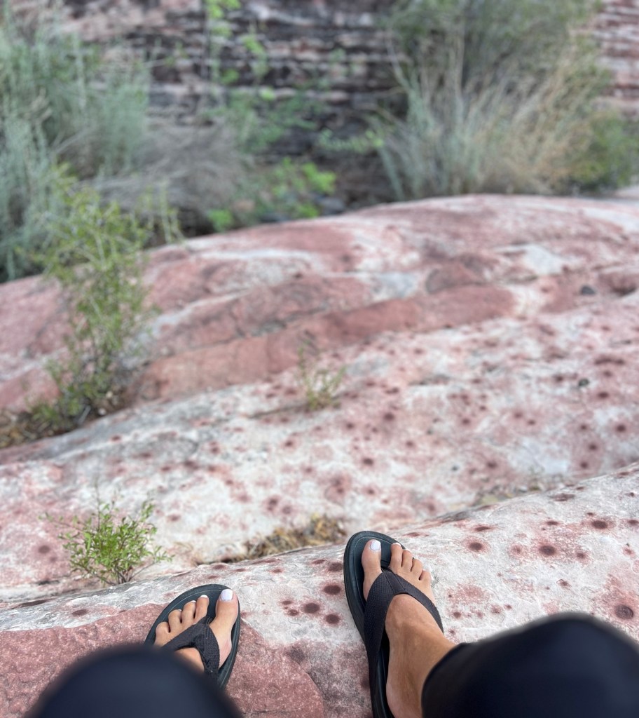 I have a slight head cold so up and out that early will be a little challenging. I was just in Red Rocks with my brother who assured me that flip flops would be fine to hike in since the paths were gravel and not steep. I will include a pic of the ‘easy non steep’ climb we did. It was super fun anyway, but you know, shoes would have been a good thing. G is saying sure, wear flip flops…