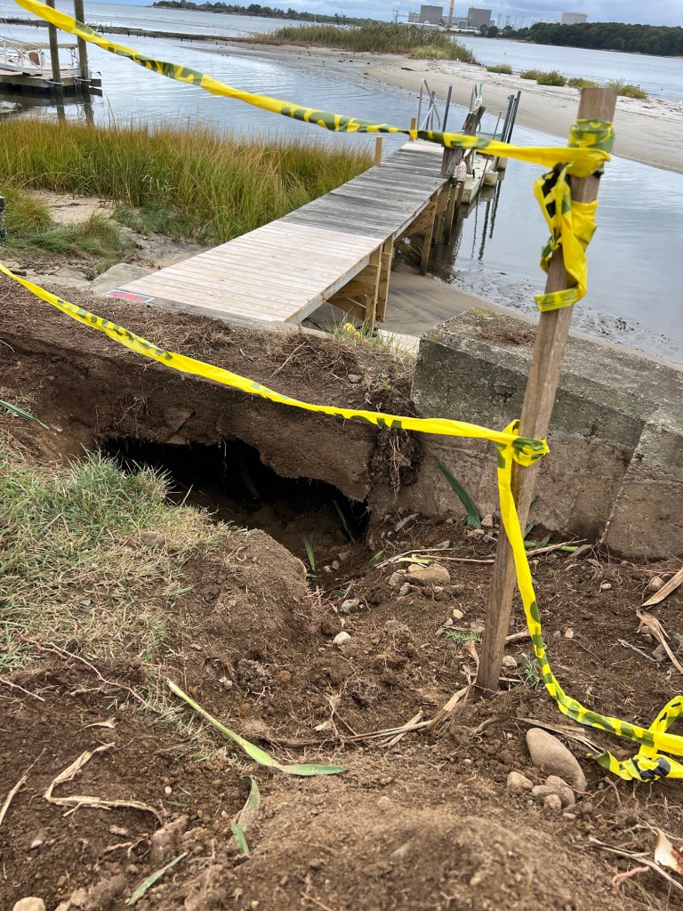 A big hole beside and under the stairs that lead down to the dock revealed itself when a bush was removed.