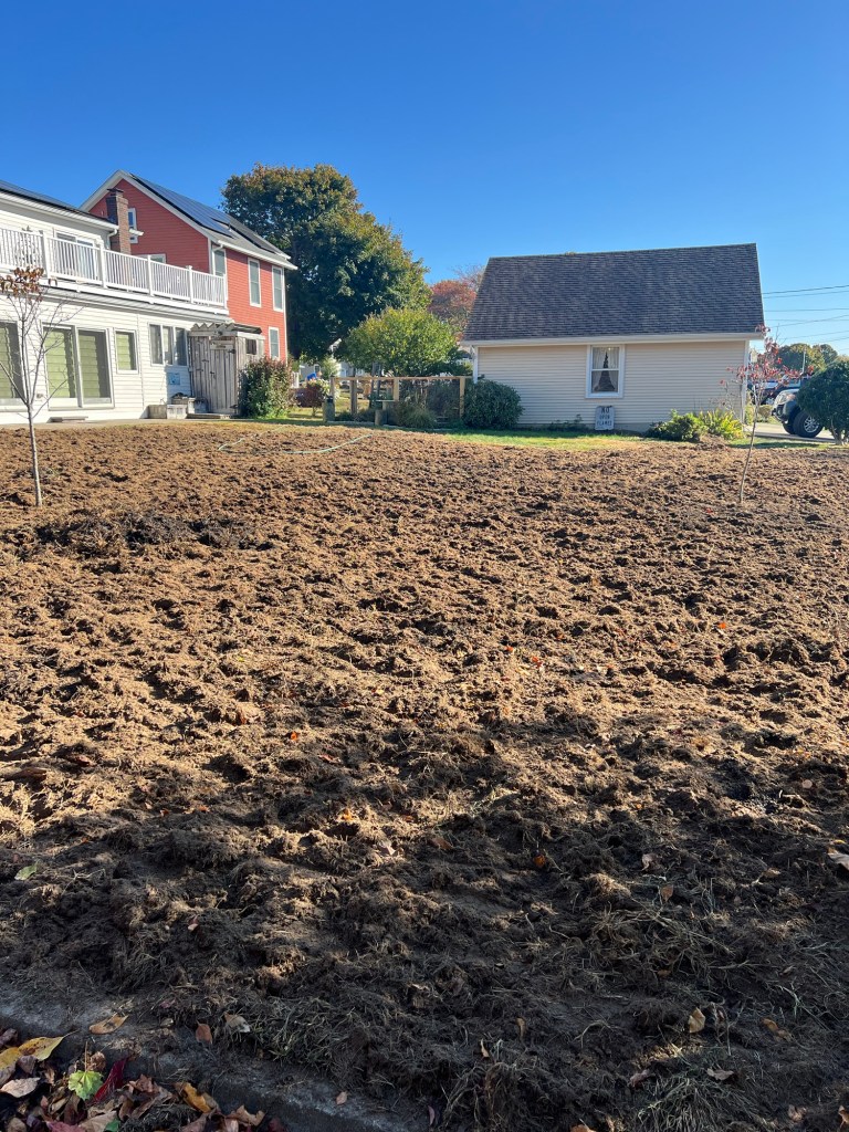 I’m helping get this lot ready to plant after the entire grassy area died from an infestation of grubs, (this is a real thing, apparently. Several people had to reseed due to grubs this year). Lots of raking and weed pulling. It’s a whole thing…