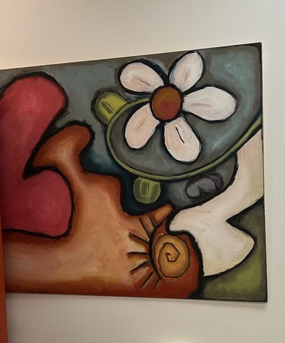 This painting is about speaking words with love. Talking through our hearts, as in putting our heart where our words come out. Gentle words inform our environment. I think even plants, flourish when spoken to kindly.
