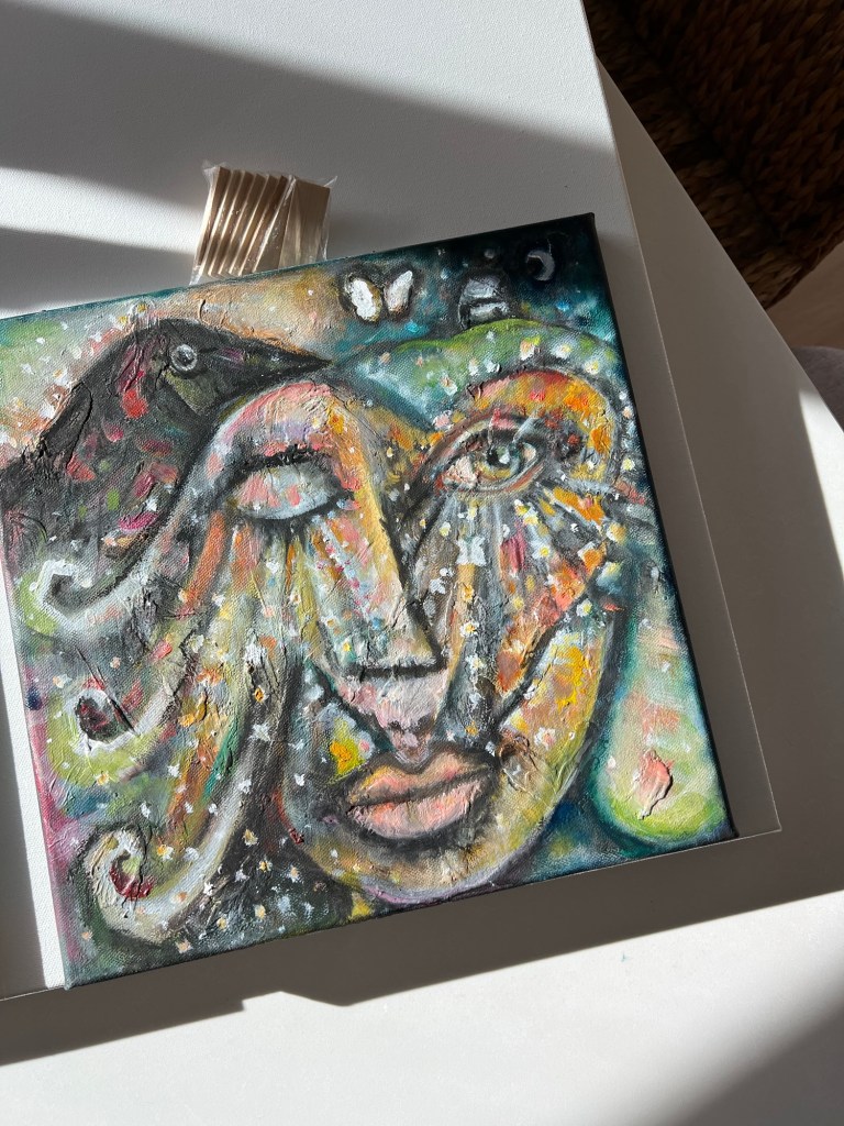 Life force, (energy), is in spaces all around . It takes up space inside cells. Energy seeps from our pores, flashes from our eyes, hovers around our being. Our aliveness is felt. This painting is a reminder that what is invisible to our human eyes, is unmistakably there. The raven in the corner is from the story of when all the light in the world was hidden. Even without being able to see, energy can be felt and known.