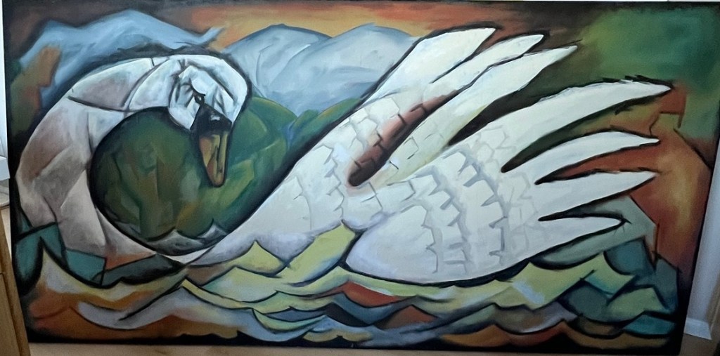 I wasn’t expecting to paint a single giant swan, anymore than I expected to see one swim up to me. He emerged little by little as I painted. They really are huge, elegant birds. There’s no telling why he thought he knew me that day. Or why I painted him, before we even met…