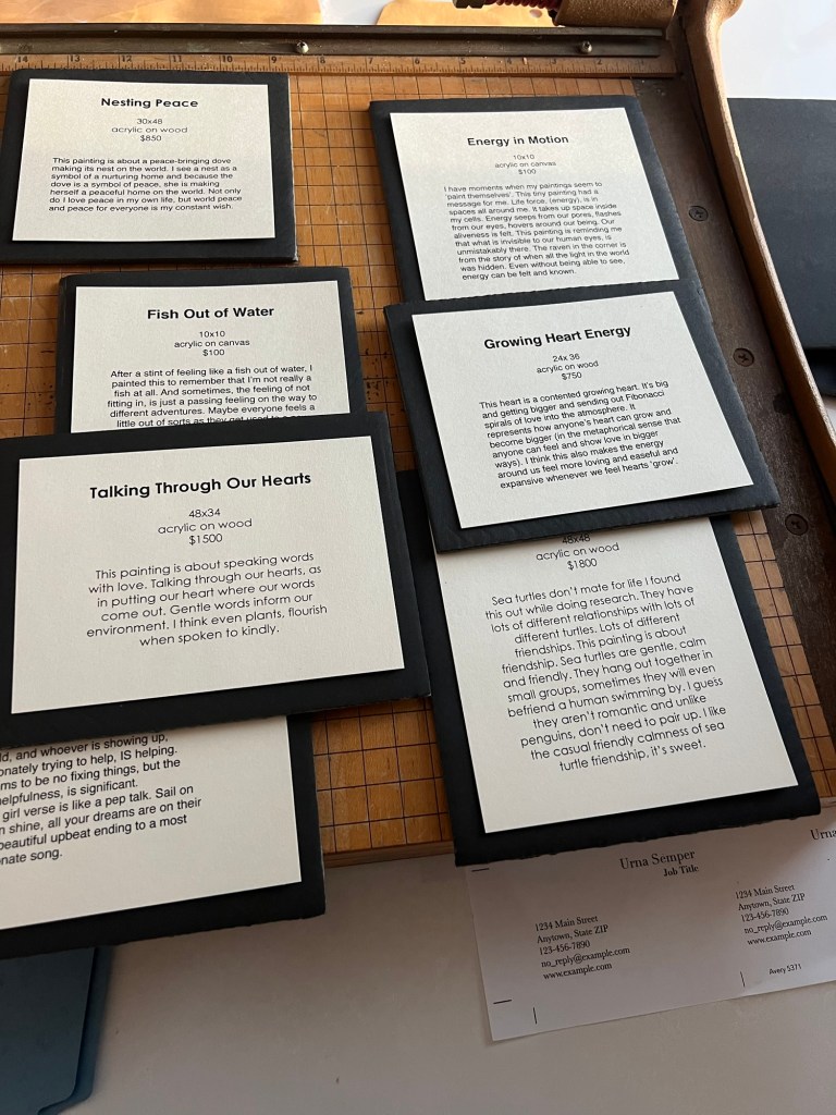 I have a different kind of confidence here. Art-show on Friday, a painting to finish and sign. Cards to get ready, emails written and sent etc, I’m feeling zero stress. As I get things ready, drive to my staging job, work long hours, I’m enjoying myself.