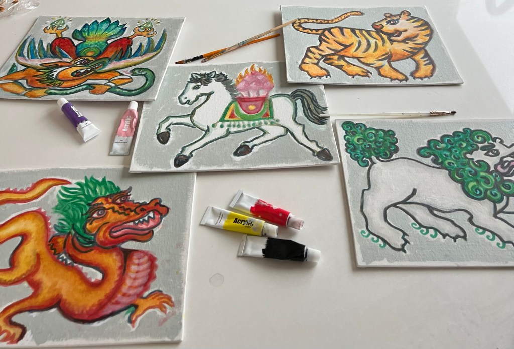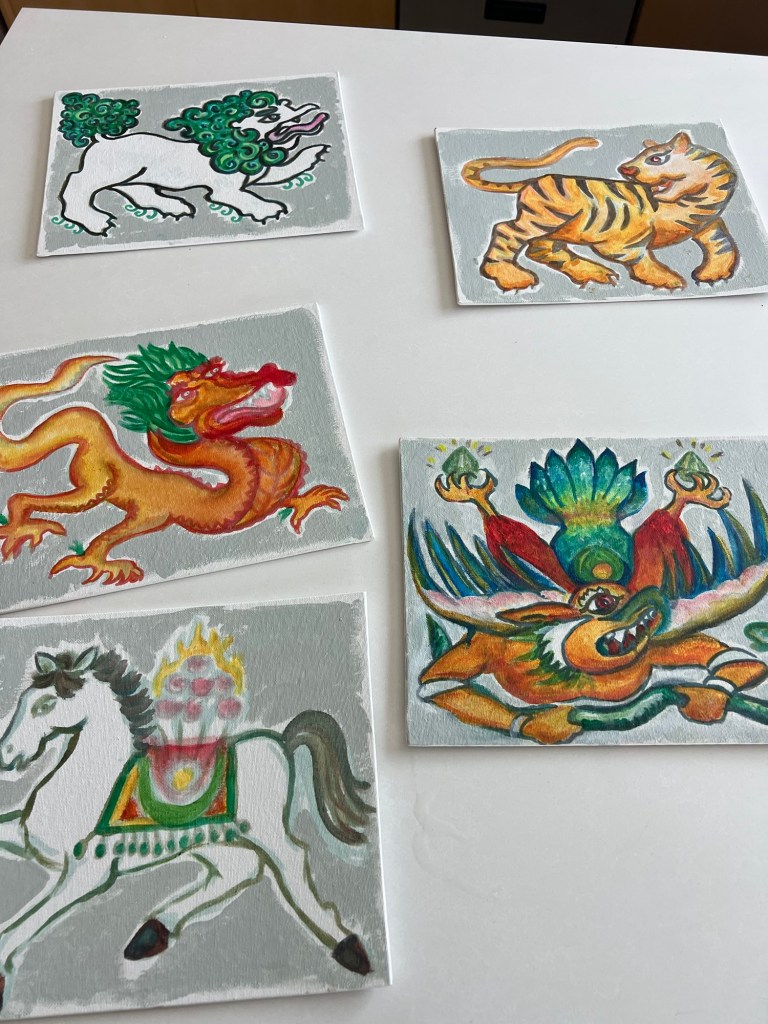 There are five images on each flag, each one representing and depicting symbolic details. As I work on this commission I’ve learned so many things. The horse is called the wind horse and carries a jewel on its back which represents good fortune.