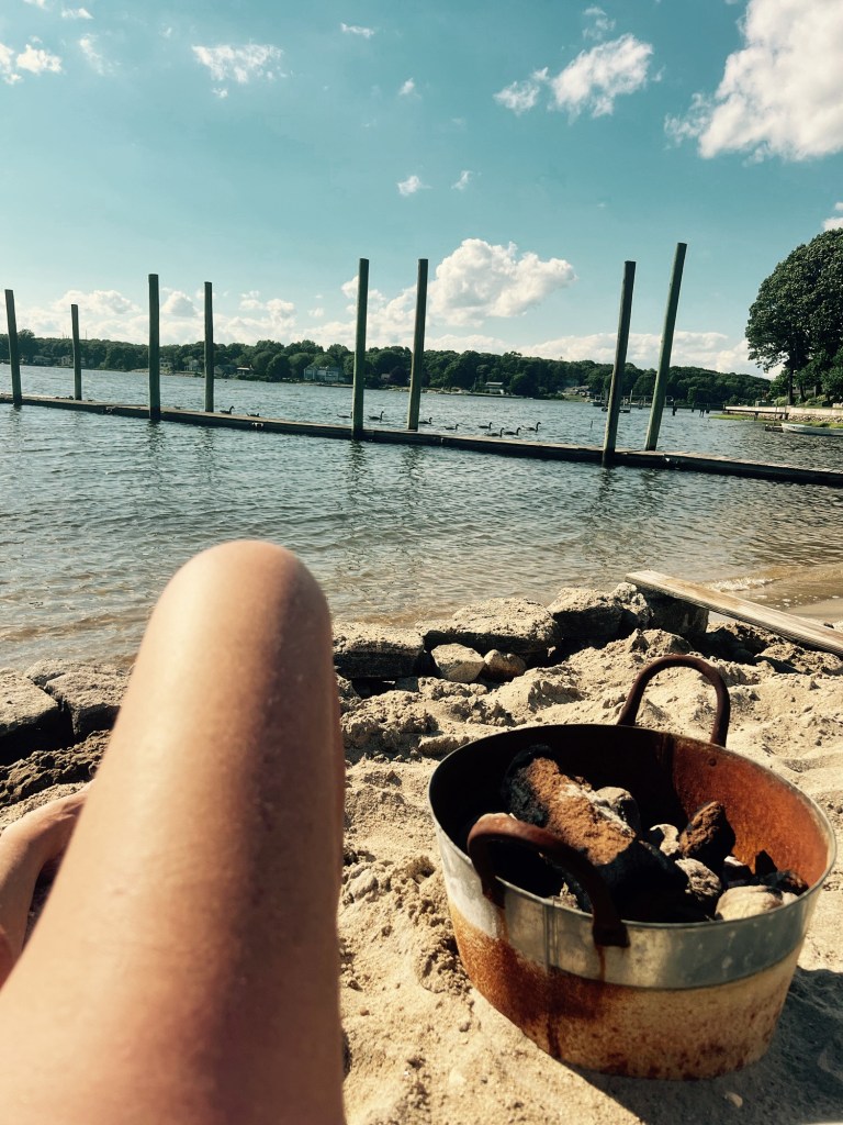 How could I not be reminded of childhood? Running up and back from the dock, barefoot in the damp grass, gardening (I’m not even sure what that is, mostly I’m picking little weeds and counting green beans, wishing a tomato would just turn red already), all day long and into the evening. Who can remember going out to play AFTER supper? Walking and walking, and walking…there are so many places to check out. Kiddie Beach, Pleasure Beach, Musquamict, our beach, the forested roadsides, Millstone point, there’s even a little store we can walk to.