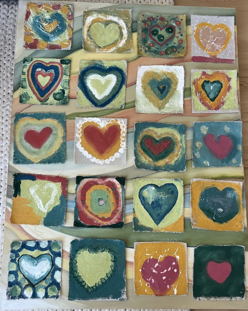 This past few weeks I’ve had the privilege of working with kids at a few elementary schools. The kids very dutifully put their hearts and souls into their work. I loved how these children instinctively brought the right amount of light and seriousness to our project. These hearts were created from their hearts with a big intention to send love out into the world.